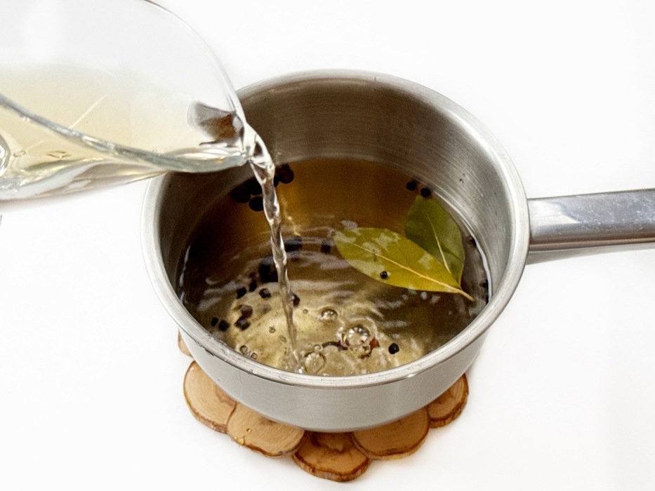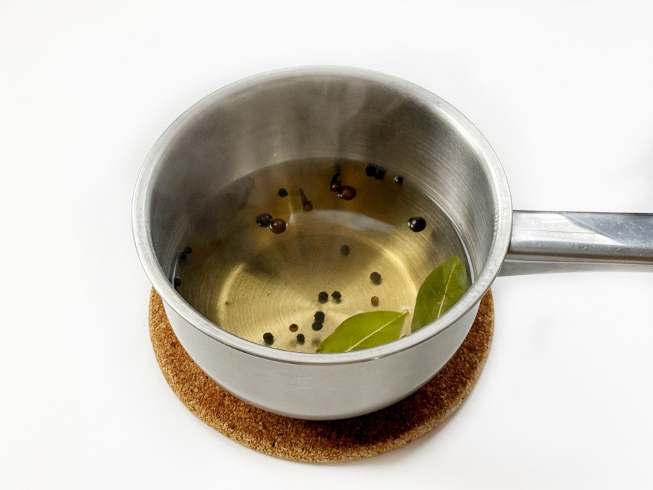 Для маринада нагреть в кастрюле воду, добавив соль, сахар, специи и прокипятить пару минут.