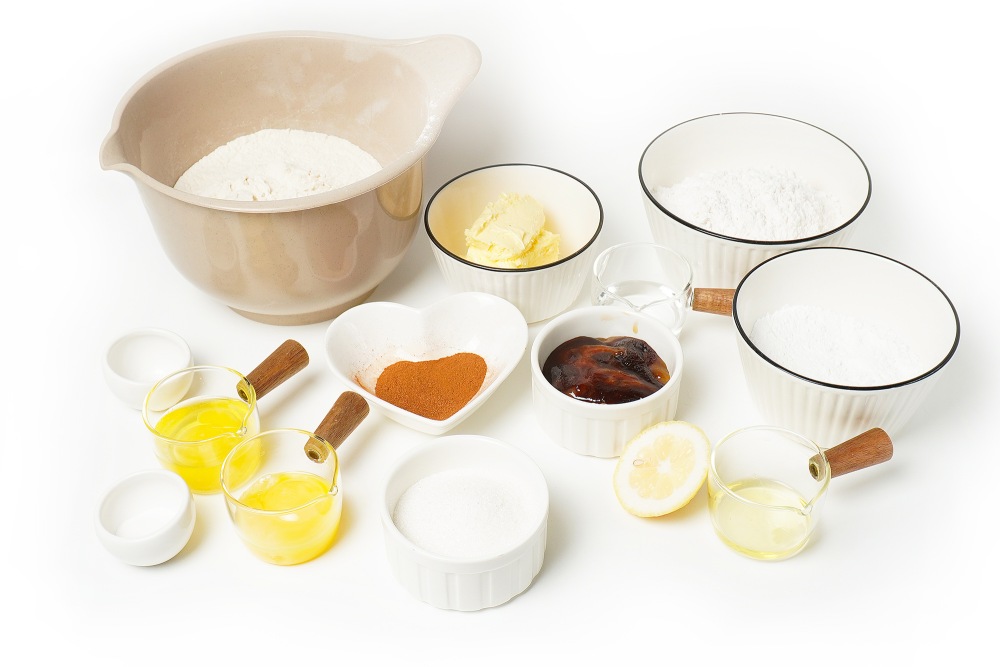 Подготовить ингредиенты: муку, мед, набор пряностей, сахар, масло, яйца, соду, соль, а также белок и сахарную пудру для глазури. Или готовую смесь для айсинга.
