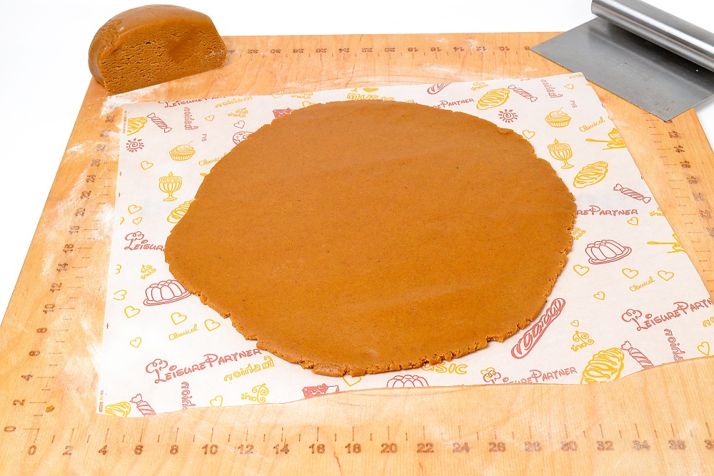 Разделить на 2 части. Раскатать в пласт толщиной 0,6-0,7 см прямо на пергаменте.