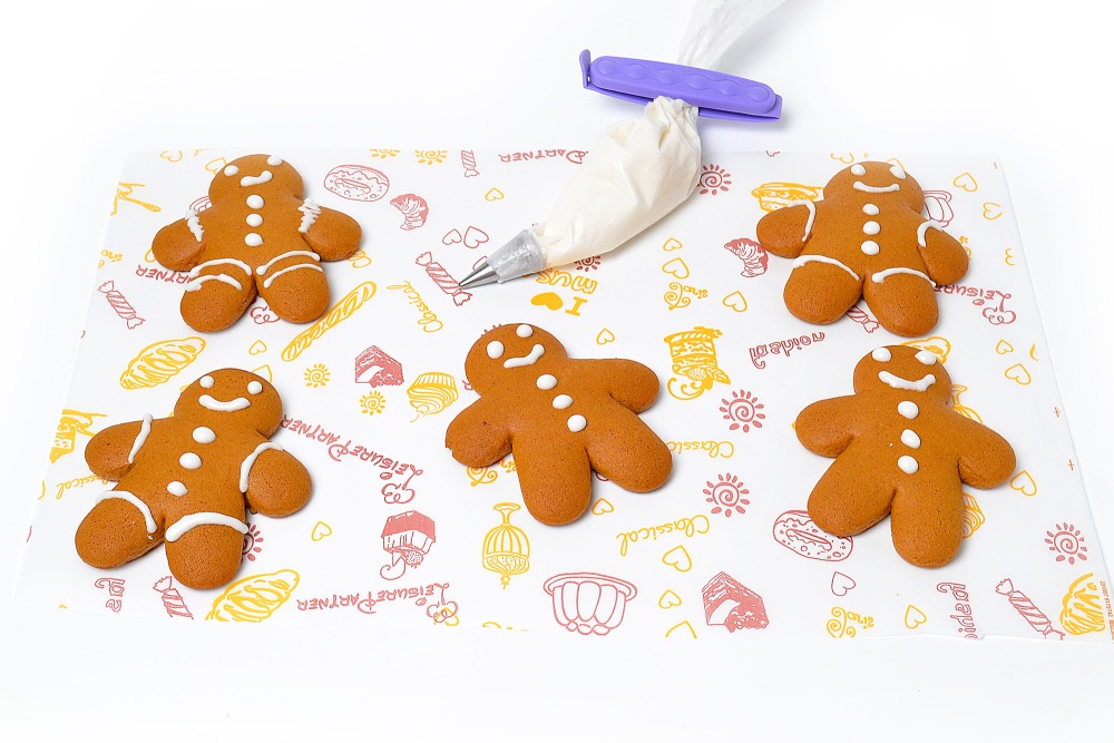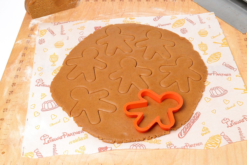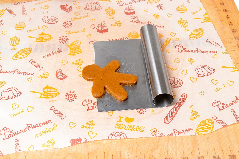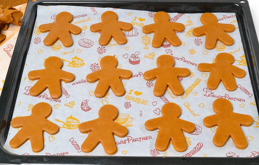 С помощью кулинарного шпателя или ножа с толстым лезвием перенести пряничных человечков на противень, аккуратно отделяя их от пергамента.