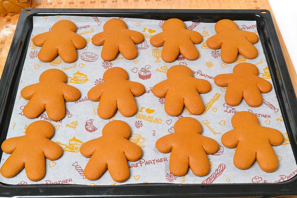 Перенести человечков на противень, используя шпатель или широкую лопатку.