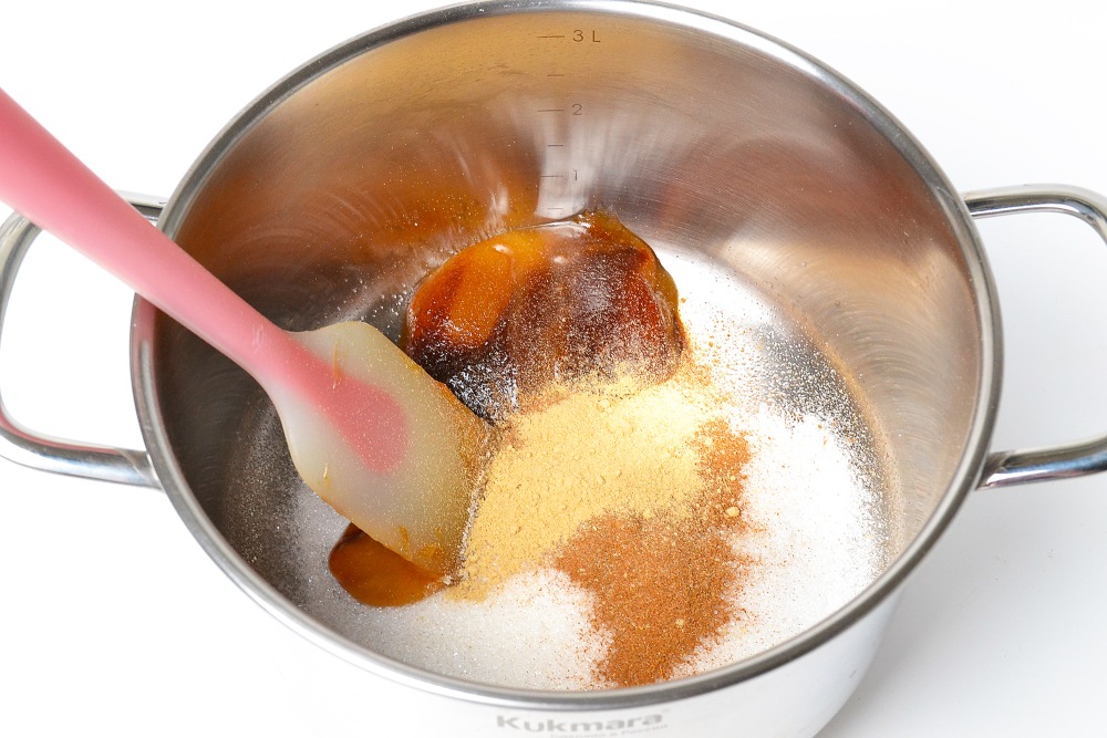 Всыпать в кастрюлю специи, сахар и добавить мед. Растопить на небольшом огне.