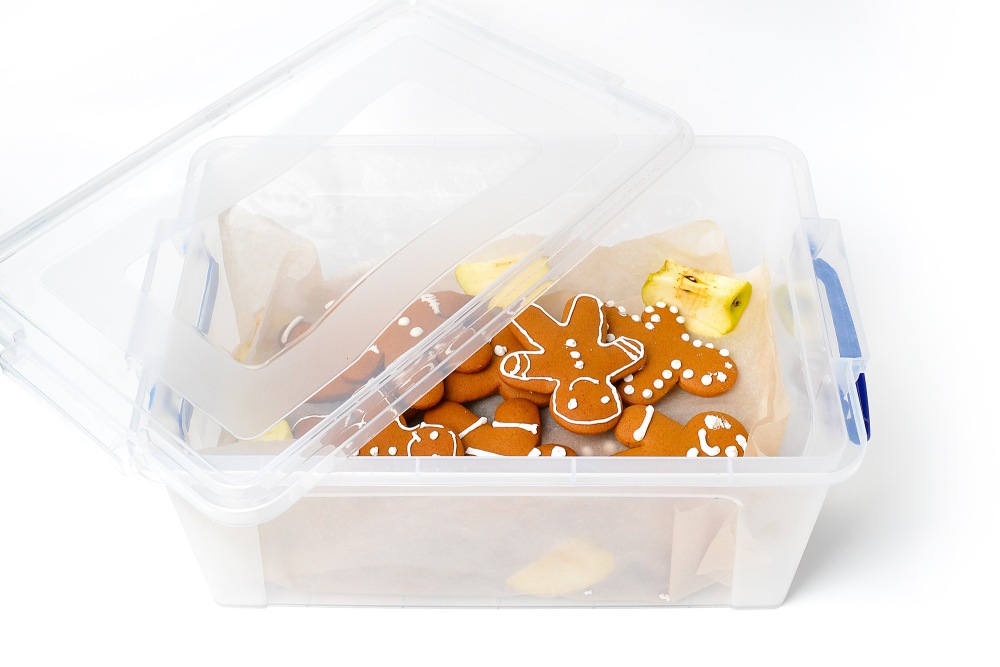 Через 2-3 часа можно убрать пряники на хранение до Нового года. Если делаете это за 2-4 недели до праздника, то уложите их на пергаментную бумагу в контейнер, прокладывая каждый слой новым листом бумаги. Плотно закройте крышку.