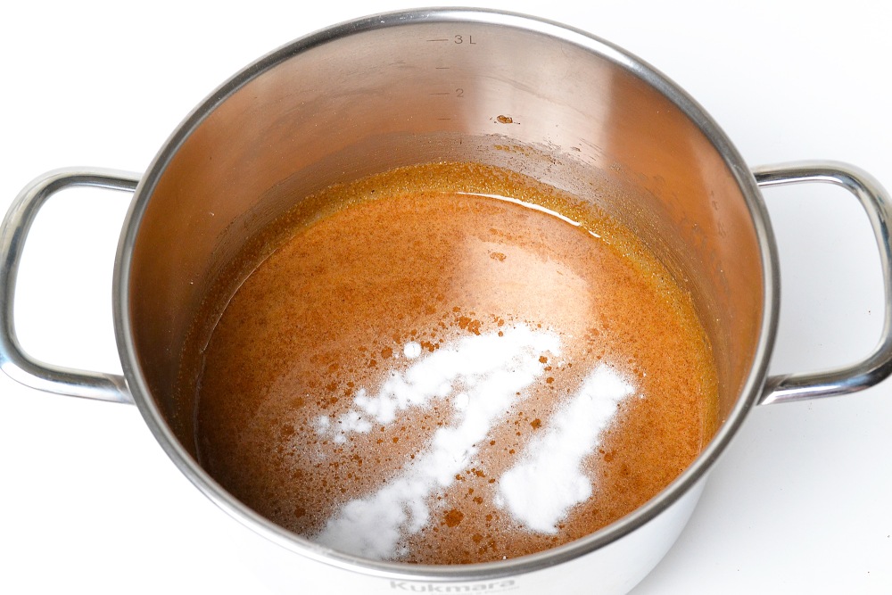 В горячую смесь всыпать соду и, не выключая огня, хорошо прогреть.