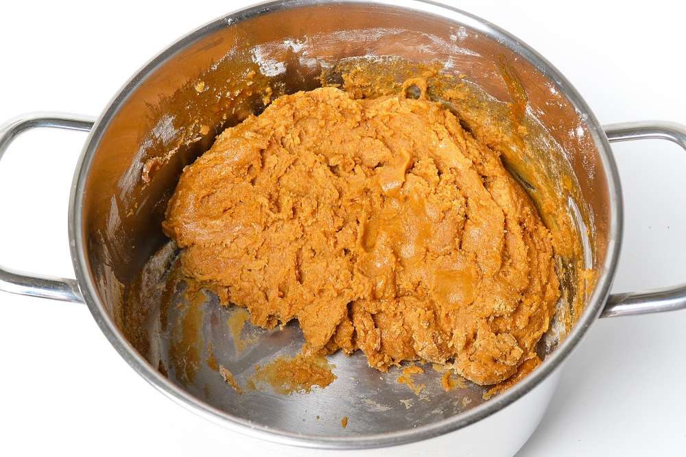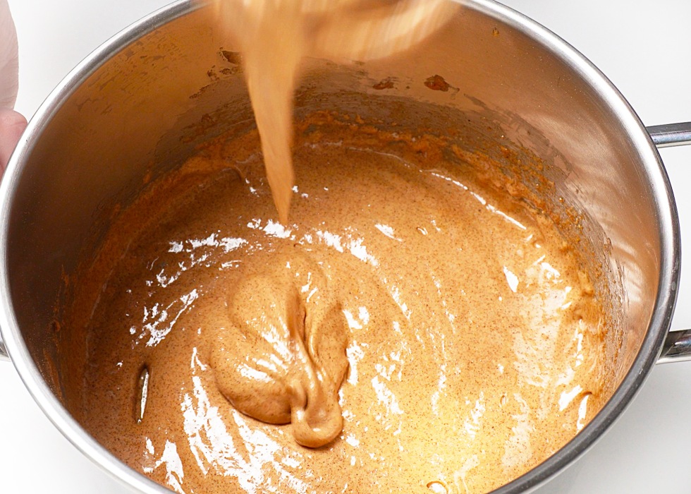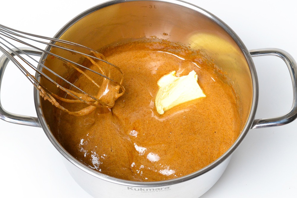 Когда сода перестанет пениться и смесь снова уменьшится в объеме, добавить масло в 2 захода. Убрать с плиты и тщательно перемешать.