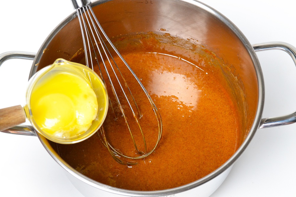 Влить яйцо и желтки, тщательно перемешать венчиком.