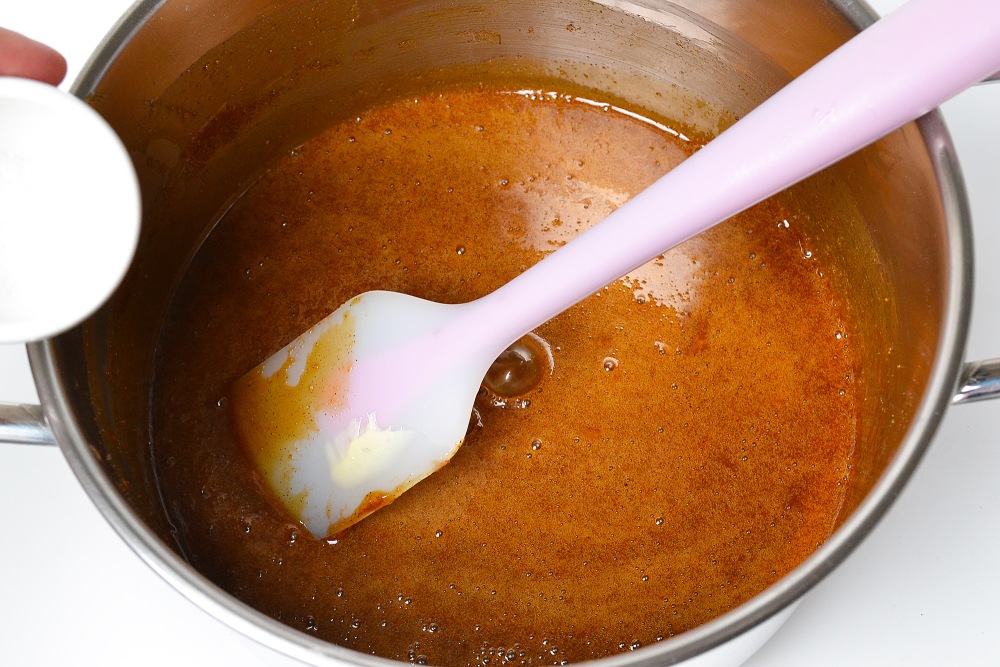 В кастрюле с толстым дном объемом 2-3 л соединить мед, сахар и полный набор специй, кроме соли. Поставить на плиту и полностью растопить сахар и мед на небольшой мощности (2-3/6 для электроплиты).