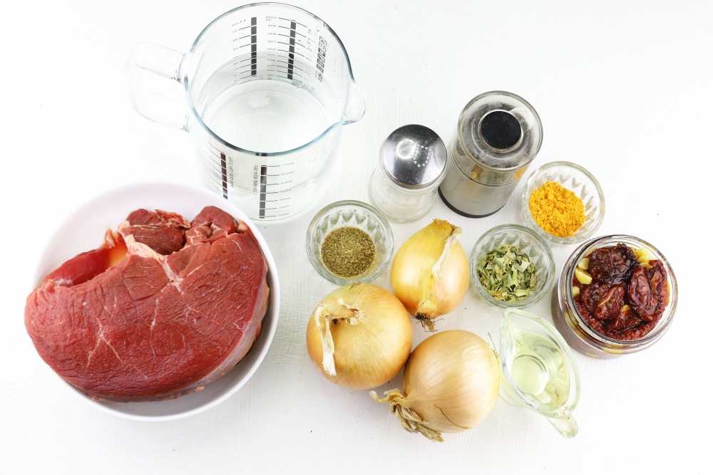 Подготовить необходимые ингредиенты для рецепта тушеной говядины в казане с луком.