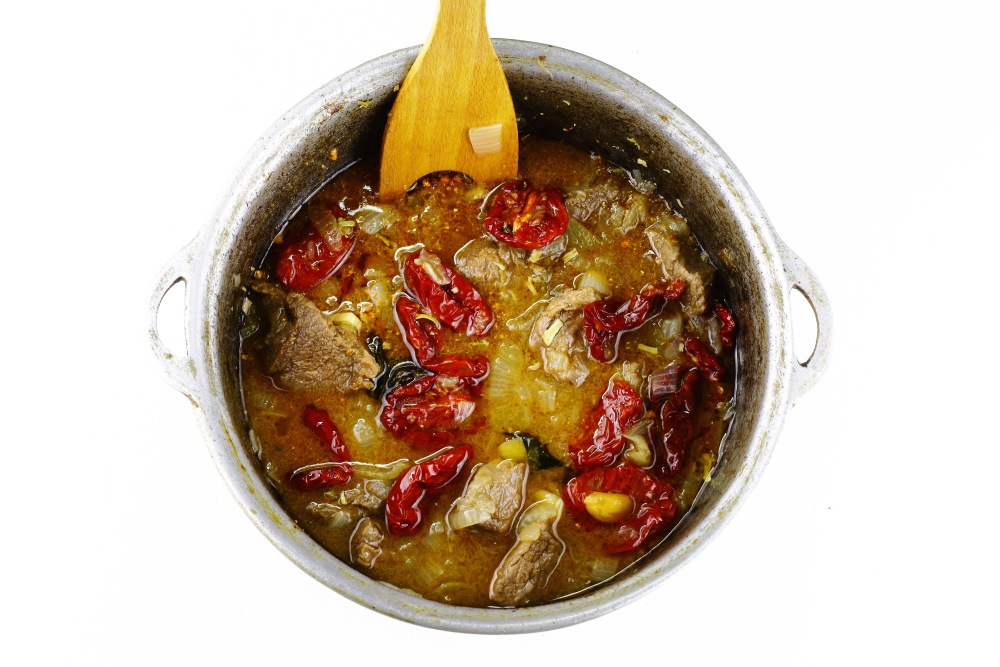 К говядине добавить вяленые помидоры. Они придадут блюду приятную кислинку и яркий вкус, который отлично сочетается с тушеным мясом. Вяленые помидоры также добавят насыщенности соусу, так как будут выделять свои соки в процессе тушения.