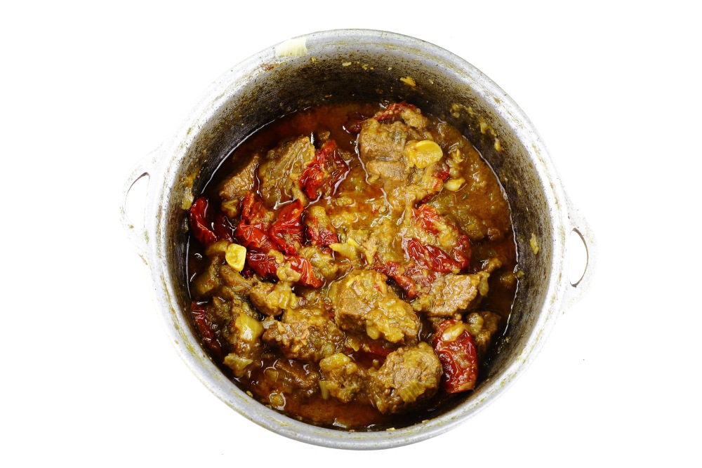 Все добавленные ингредиенты хорошо перемешать с говядиной, чтобы специи и ароматы равномерно распределились по мясу. Продолжать тушить до мягкости мяса.