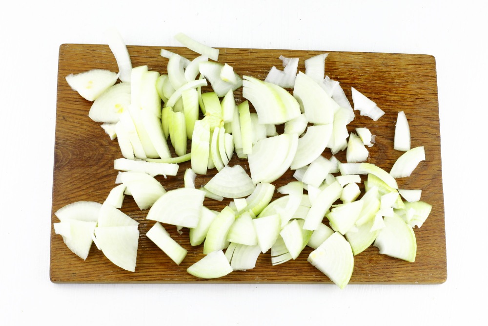 Лук очистить, промыть под холодной водой. После этого аккуратно обсушить с помощью бумажных полотенец. Нарезать четверть кольцами.