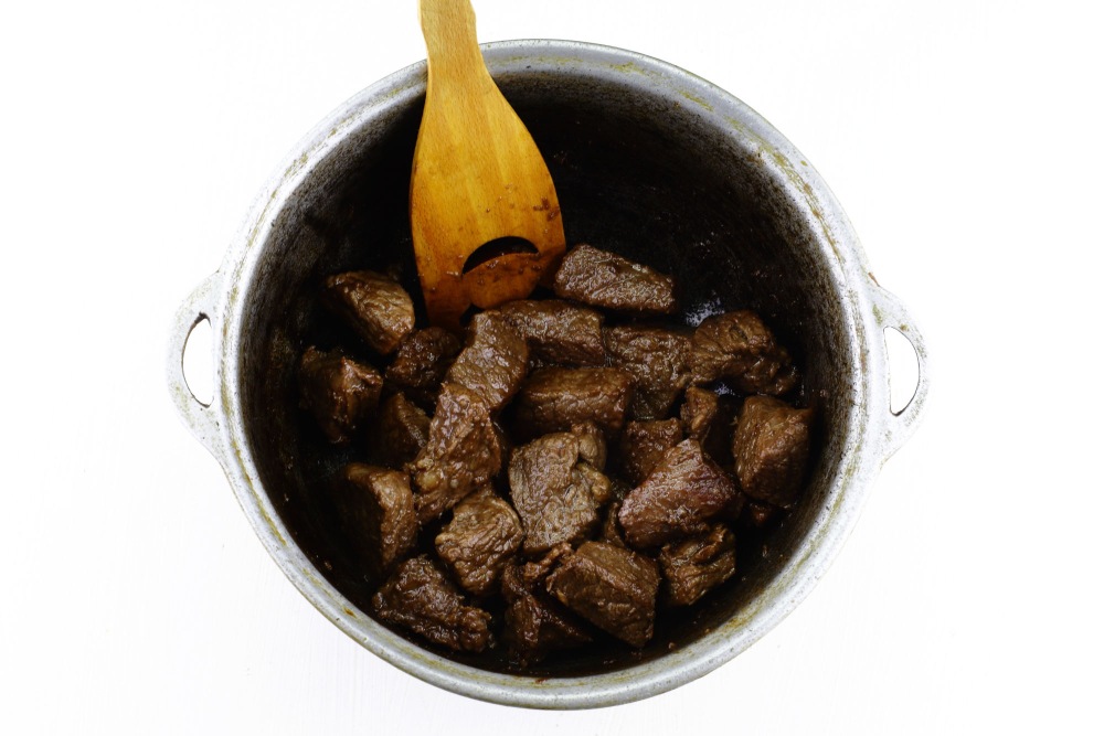 Увеличить огонь выше среднего. В процессе жарки периодически помешивать мясо, чтобы оно подрумянилось равномерно со всех сторон. Говядина начнет выделять сок, но постепенно вся жидкость должна испариться, и кусочки мяса начнут подрумяниваться. Этот процесс займет около 10–20 минут, в зависимости от количества мяса и температуры.