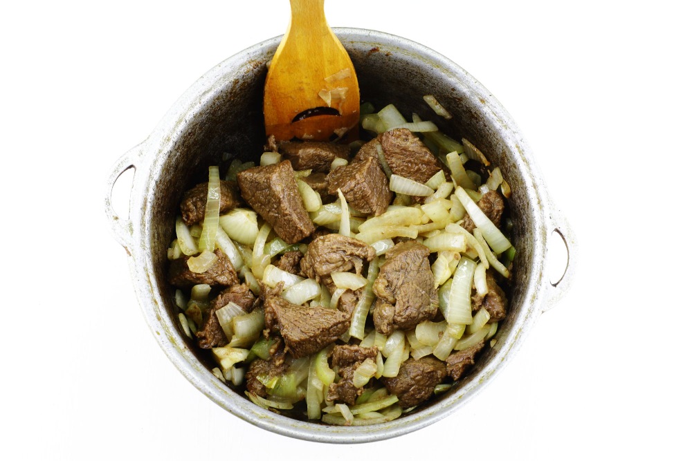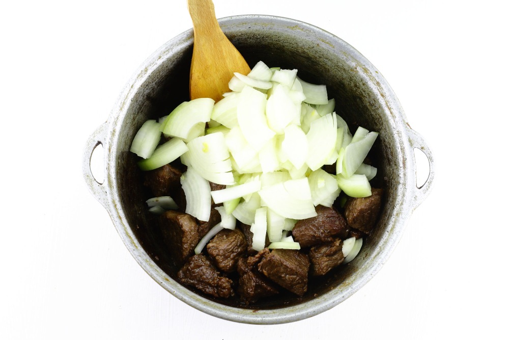 Добавить в казан нарезанный лук, когда мясо подрумянится и вся жидкость испарится. Распределить его равномерно по мясу, чтобы он начал обжариваться в остатках жира и соках, которые выделились из мяса.