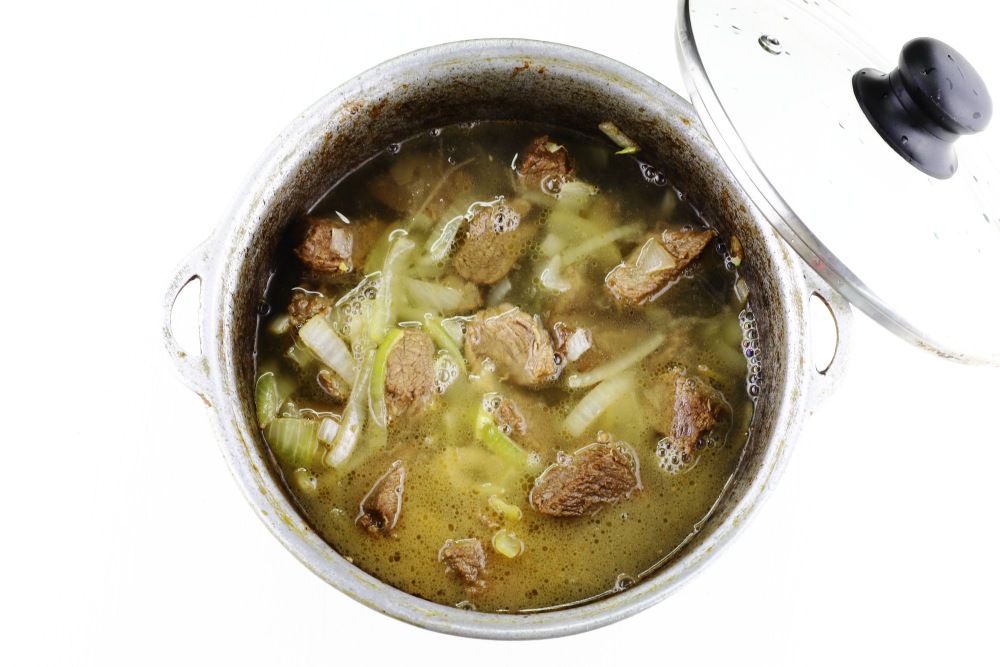 Количество воды зависит от того, сколько соуса вы хотите получить, но обычно для тушения говядины в данном рецепте достаточно 500 мл. Вода должна почти покрывать мясо, но не заливать его полностью. Аккуратно перемешать мясо с луком и водой, чтобы все ингредиенты хорошо соединились. Увеличить огонь, чтобы жидкость в казане закипела. Как только вода начнет кипеть, уменьшить огонь до низкого уровня, чтобы началось медленное тушение. После того как вода закипит, накрыть казан крышкой. Это важно, чтобы сохранить тепло и обеспечить равномерное тушение.