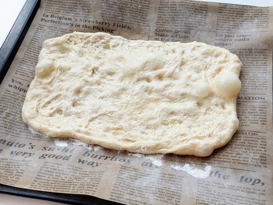 Подготовить лист для выпечки, слегка присыпав его мукой, это создает эффект настоящей римской пиццы. Смазать руки оливковым маслом и выложить тесто, аккуратно растягивая его в прямоугольный пласт.