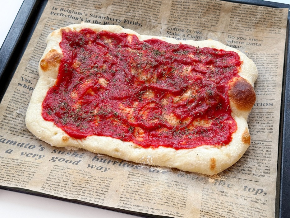Подпеченную основу смазать томатной пастой и посыпать орегано.
