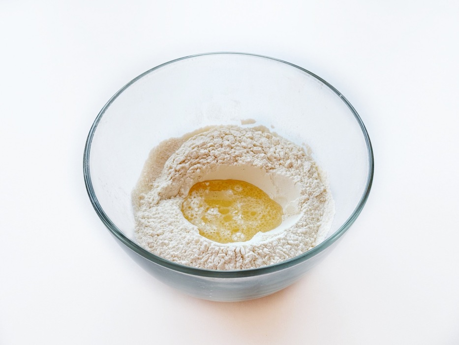 Влить постепенно воду, перемешать тесто.