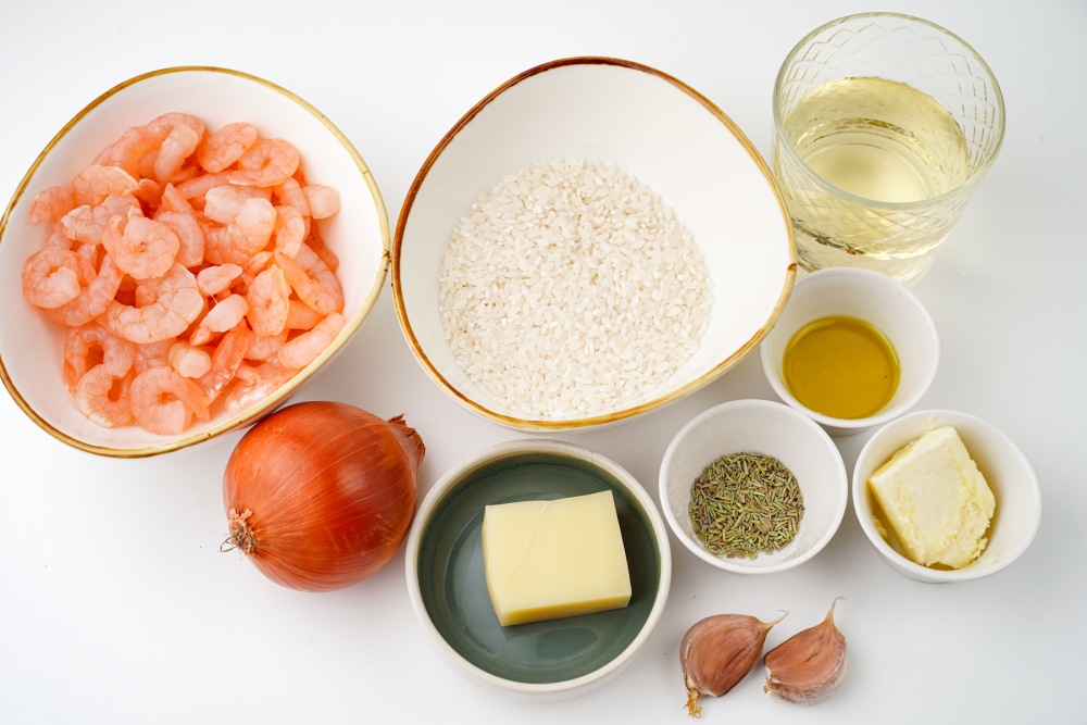 Подготовить все ингредиенты заранее, чтобы в процессе приготовления ризотто с креветками, как в ресторане, ничего не отвлекало. Креветки полностью разморозить, если они были замороженные, промыть и обсушить бумажными полотенцами. Для ризотто выбрать специальный рис с высоким содержанием крахмала - лучше всего подойдёт арборио, карнароли или виалоне нано. Такой рис при варке отдаёт крахмал и делает блюдо кремовым, а не рассыпчатым.