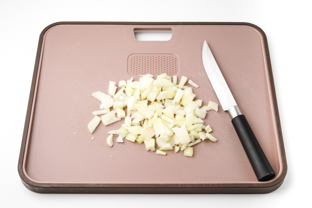 Очистить лук от шелухи, мелко нарезать острым ножом, стараясь делать кусочки одинакового размера, чтобы лук готовился равномерно.