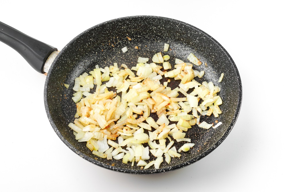 Добавить оливковое масло, выложить нарезанный лук и обжарить.
