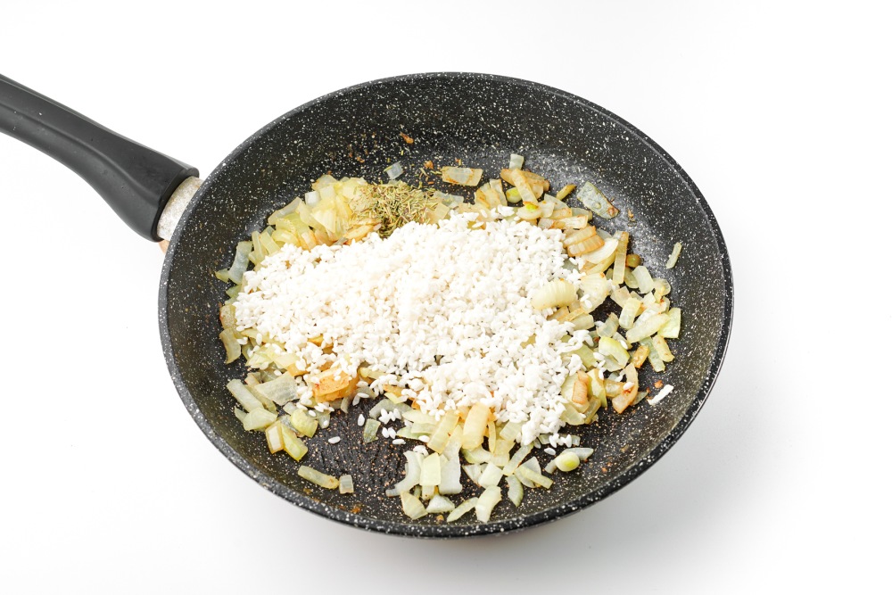 Промыть рис под холодной водой до прозрачности, дать воде стечь и высыпать рис к луку. Добавить тимьян. Перемешать и прогреть рис 1-2 минуты, чтобы зёрна покрылись маслом и стали слегка полупрозрачными по краям.