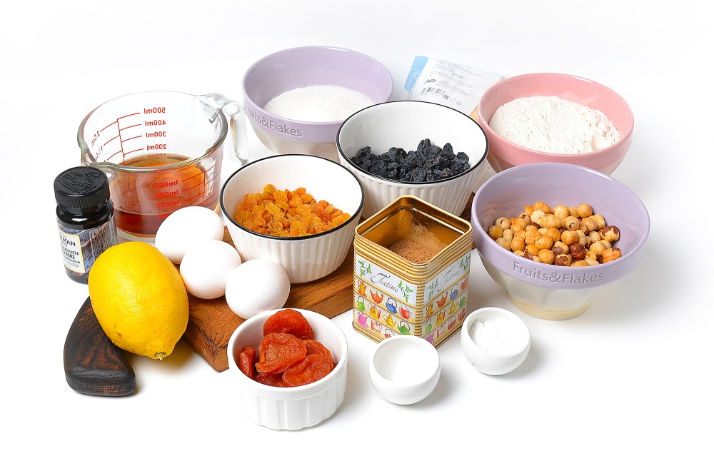 Подготовить ингредиенты: масло, яйца, 2 вида сахара, разрыхлитель, муку для теста, сухофрукты и орехи для начинки, а также коньяк или ром, плюс пудру и сок лимона для глазури.
