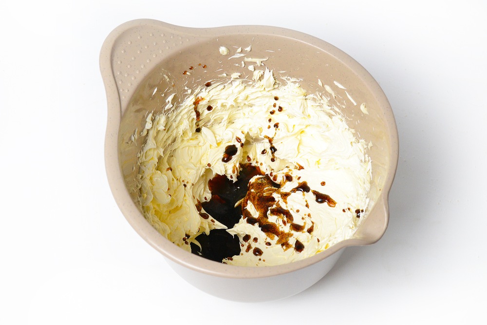 Сливочное масло взбить до осветления на сильных оборотах миксера и добавить ванильную эссенцию. Еще раз взбить на максимальных оборотах в течение 1 минуты.