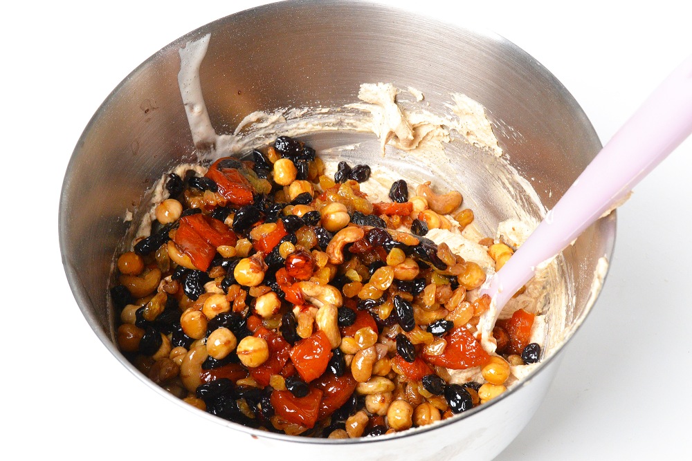 Всыпать в него заранее подготовленные сухофрукты в коньяке. Тщательно перемешать лопаткой.