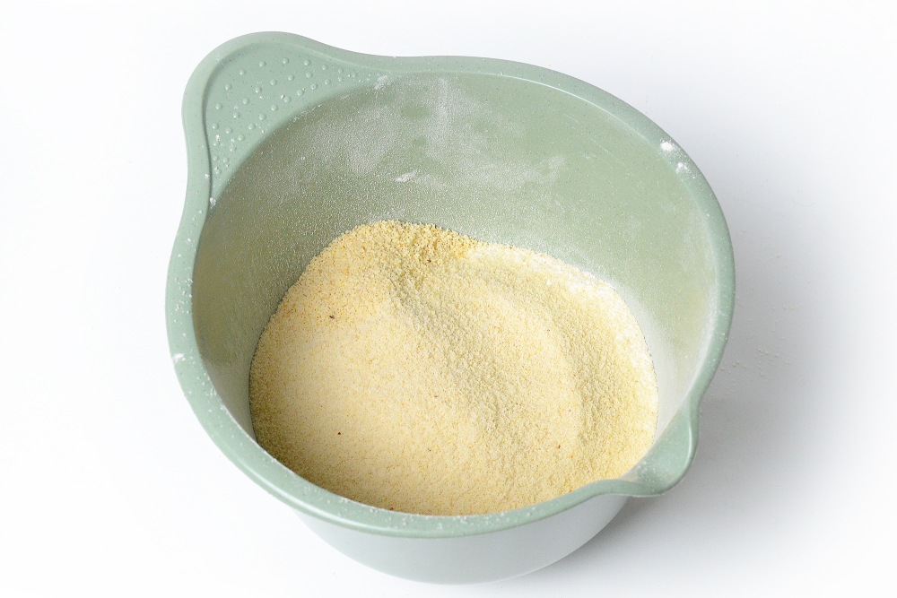 Пока взбиваются яйца, просеять миндальную и пшеничную муку.