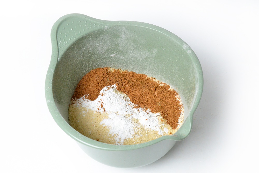 Всыпать разрыхлитель и специи, желательно просеять их через сито. Смешать все венчиком.