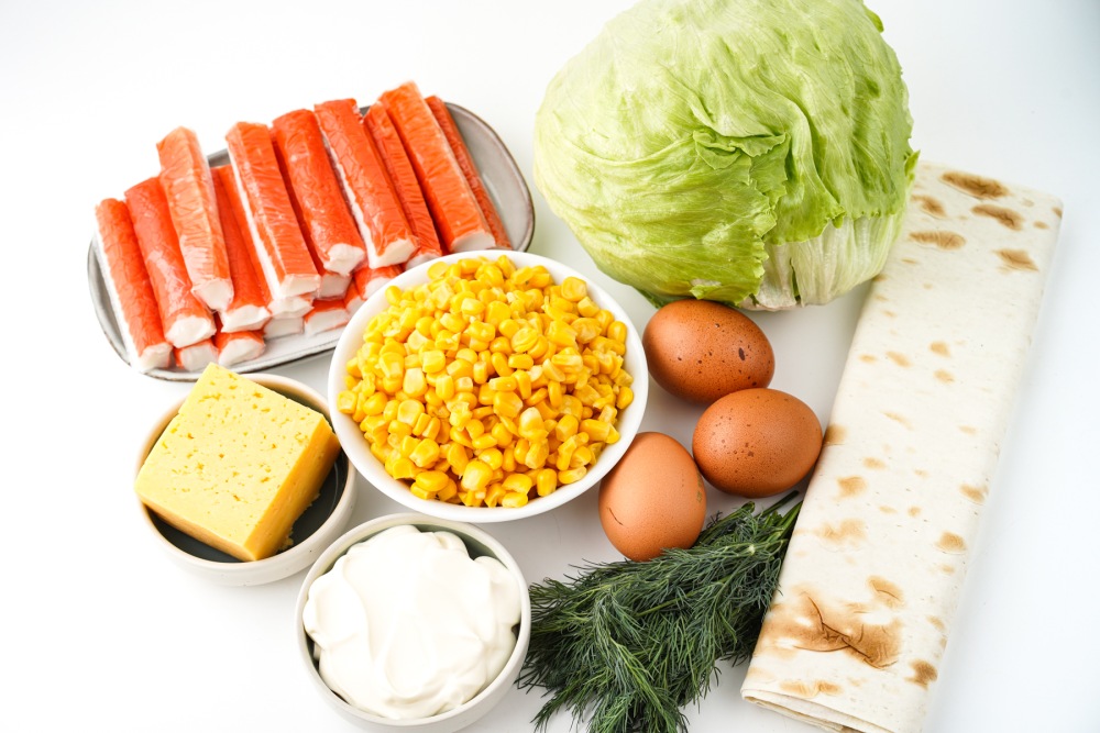 Подготовить ингредиенты. Не доставать лаваш из упаковки заранее, чтобы он не высох и не ломался при сворачивании. Слить лишнюю жидкость из кукурузы. Салат айсберг можно заменить любым другим салатом или пекинской капустой. Можно заменить огурцом, но вариант с салатом лучше. Он тоже дает свежесть, но при этом не дает лишнюю жидкость.