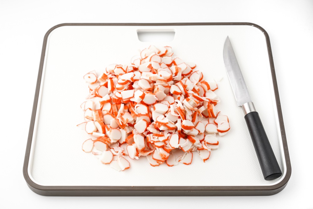 Снять упаковку, разрезать палочки сначала вдоль, затем поперёк, чтобы получились небольшие аккуратные кусочки. Стараться нарезать примерно одинаково, чтобы начинка была однородной.