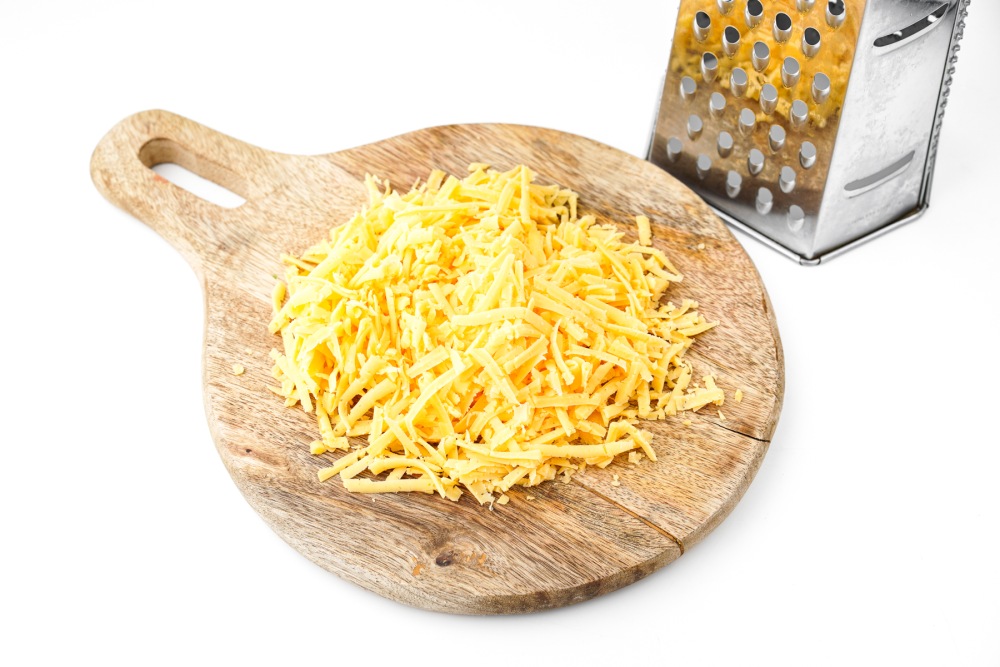 Натереть сыр. Использовать среднюю тёрку, чтобы сыр не сбивался в комки и хорошо распределялся по начинке.