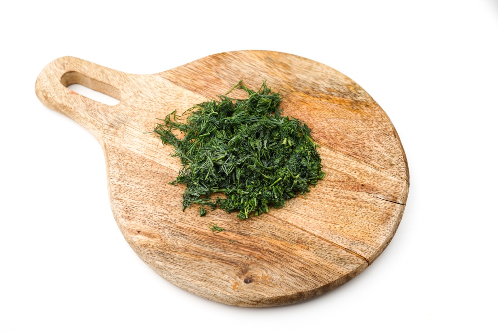 Промыть и обсушить укроп. Удалить толстые стебли, мелко нарезать зелень ножом, чтобы она равномерно распределилась и не выбивалась крупными кусочками.