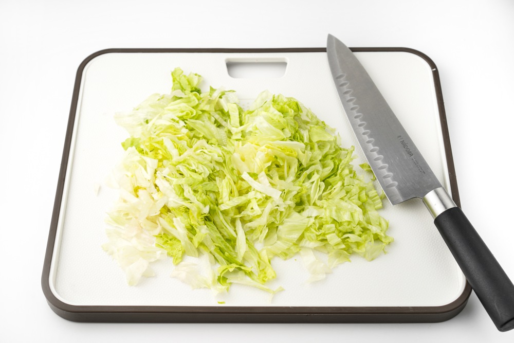 Промыть листья, хорошо обсушить и нарезать тонкой соломкой. Важно, чтобы салат был сухим, лишняя влага сделает начинку водянистой.