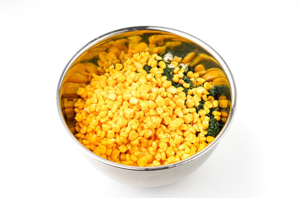 Соединить ингредиенты в глубокой миске. Добавить кукурузу.