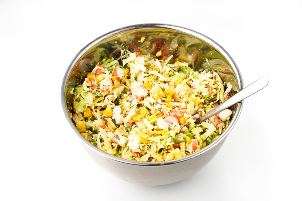 Соединить ингредиенты в глубокой миске. Выложить крабовые палочки, яйца, сыр, укроп, салат и добавить консервированную кукурузу, предварительно слив с неё жидкость.