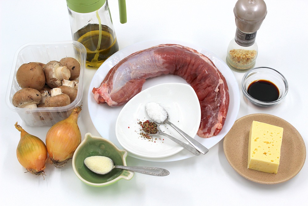 Подготовить ингредиенты для рулета из свиной вырезки с грибами и сыром.