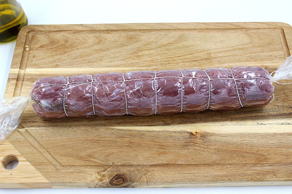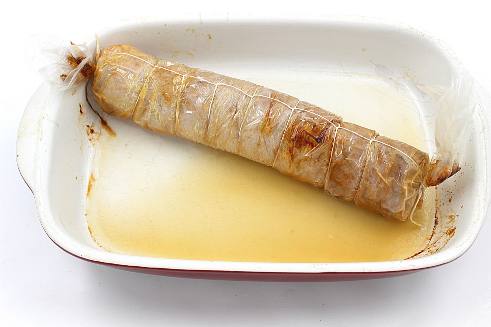 Рулет из свиной вырезки закрутить в рукав для выпечки и обвязать кулинарной нитью