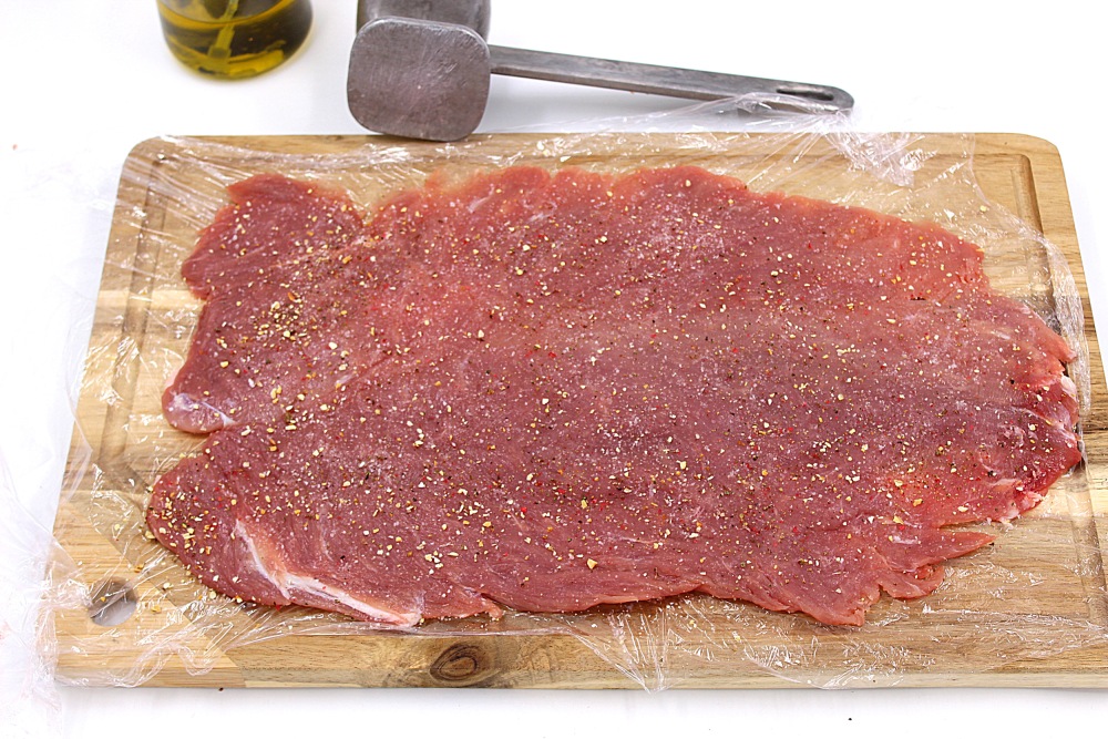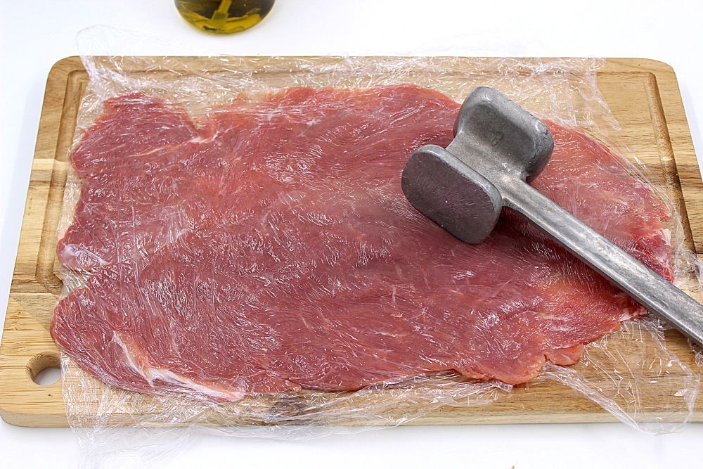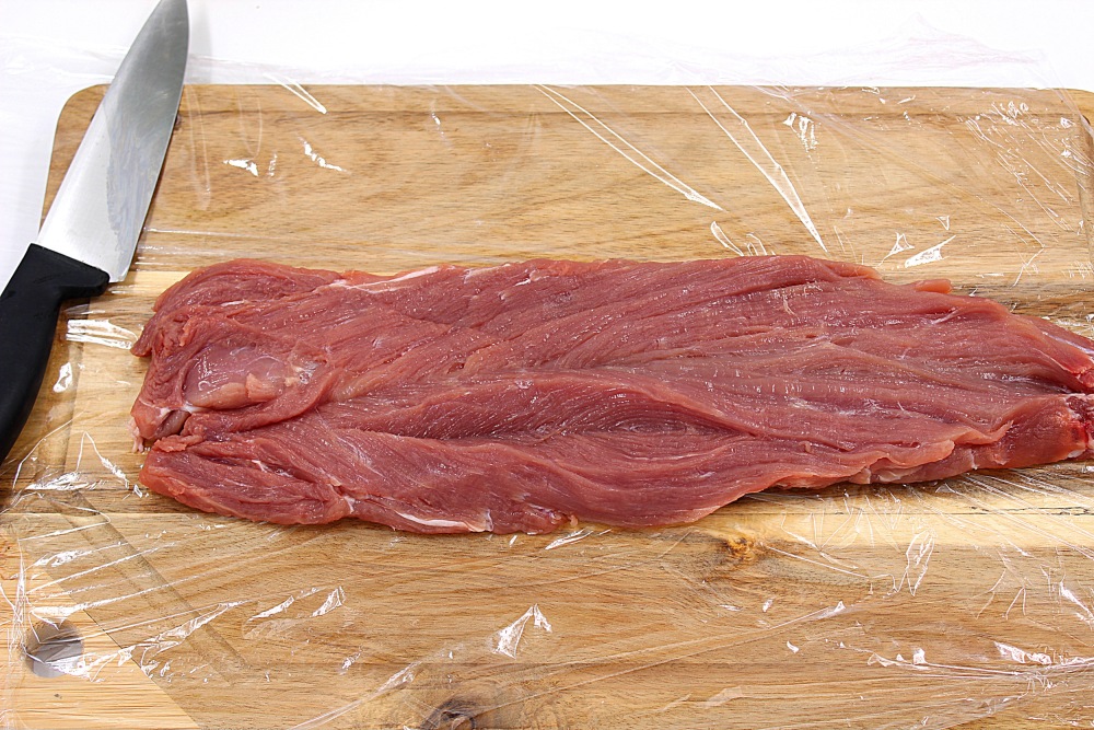 – Бывает, что свиные вырезки продаются малого размера. В этом случае возьмите 2 и после отбивания просто по краю наложите одну на другую, делая мясной пласт шире.