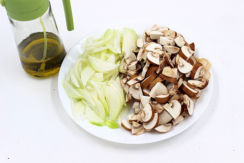 Нарезать тонкими перьями лук и небольшими кусочками грибы.