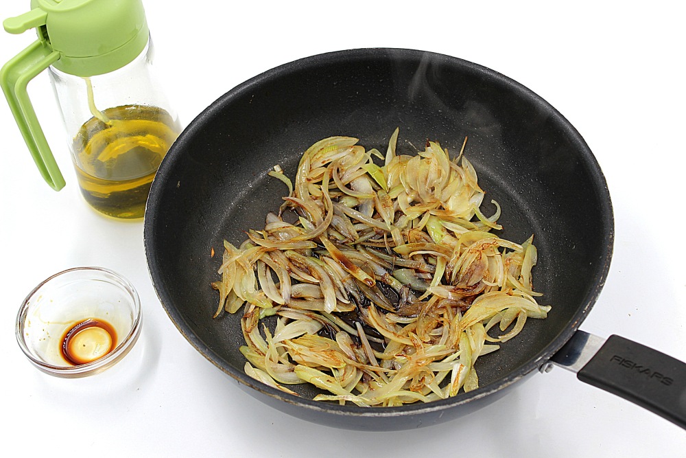 На растительном масле обжарить лук, примерно через 3 минуты добавить сахар, еще через 2 - соевый соус.