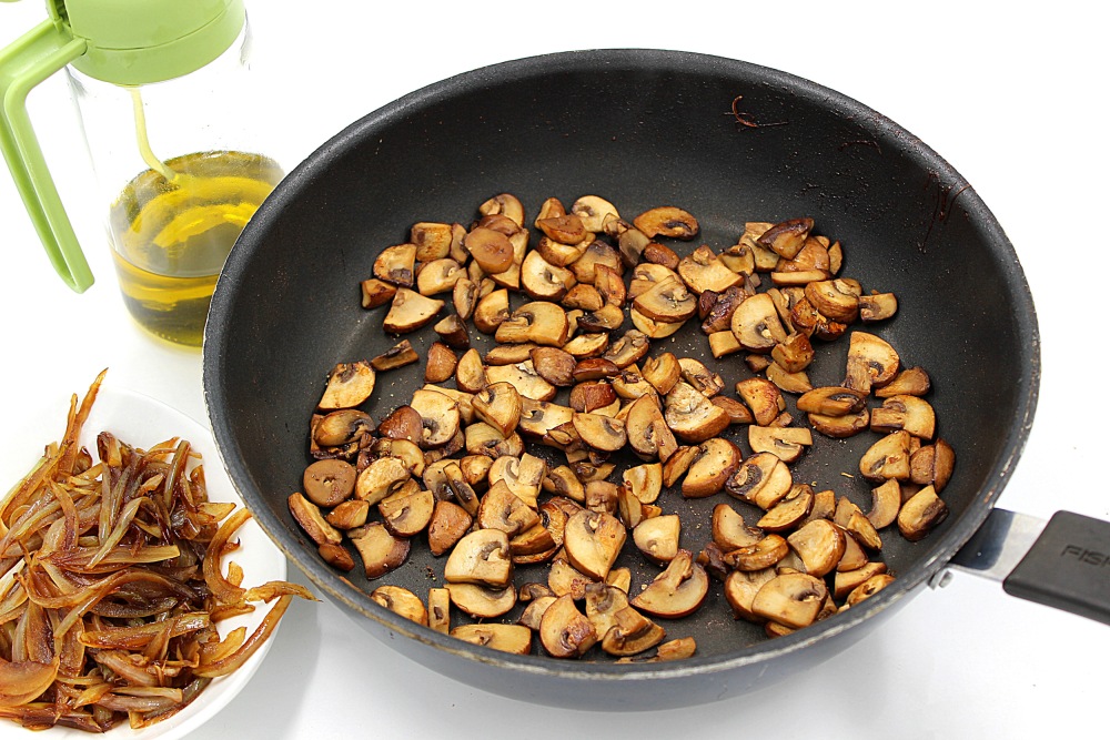 Выбрать лук, вытереть салфеткой сковороду. Добавить одну ложку растительного масла и жарить грибы.