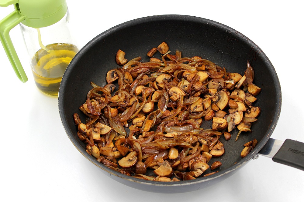 Выбрать лук, вытереть салфеткой сковороду, добавить масло, жарить грибы.