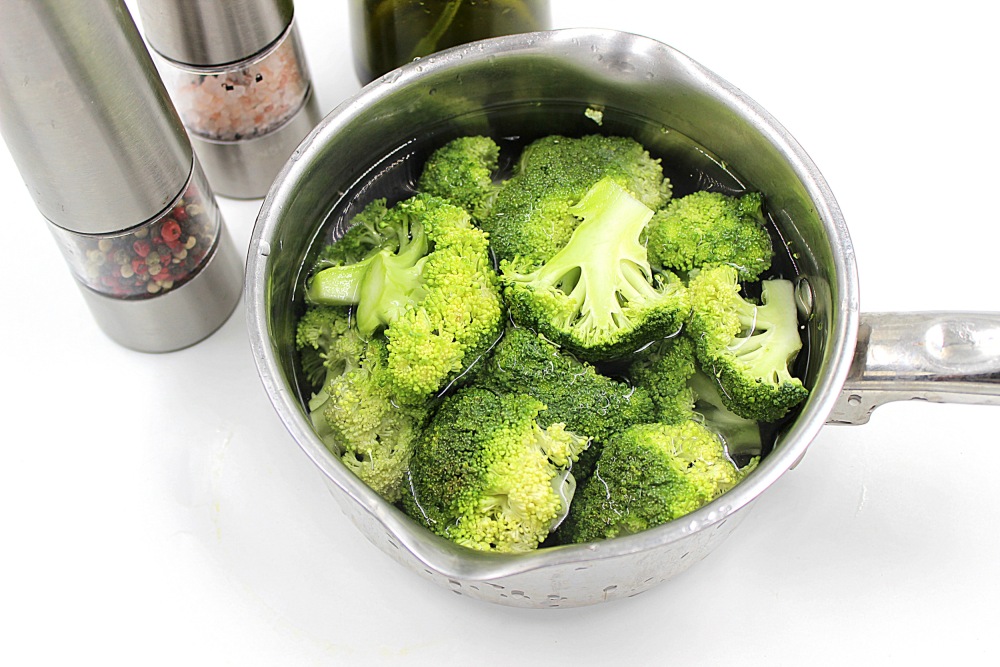 Брокколи 2 минуты проварить в подсоленной воде. После откинуть на дуршлаг. 2 минуты, не надо больше.