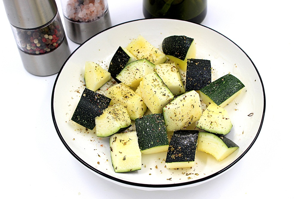 Цукини нарезать средними кусочками, немного посолить, поперчить и присыпать оставшимися травами.