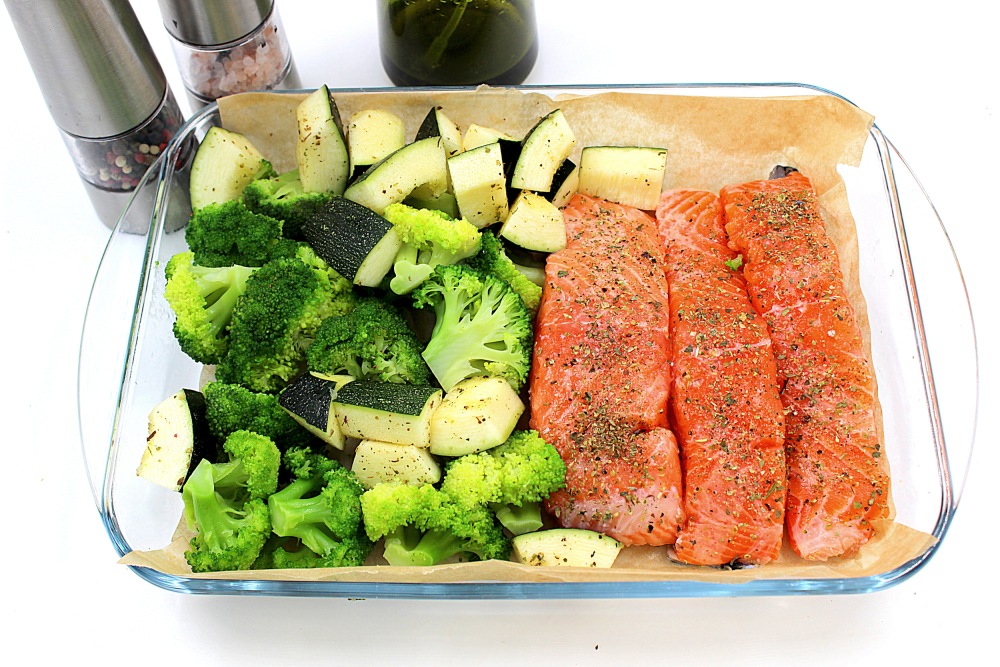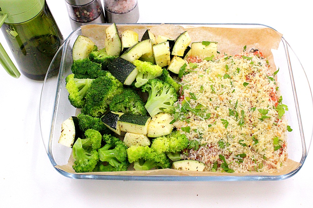 Выложить всё в форму для выпечки: лосось, брокколи и цукини.