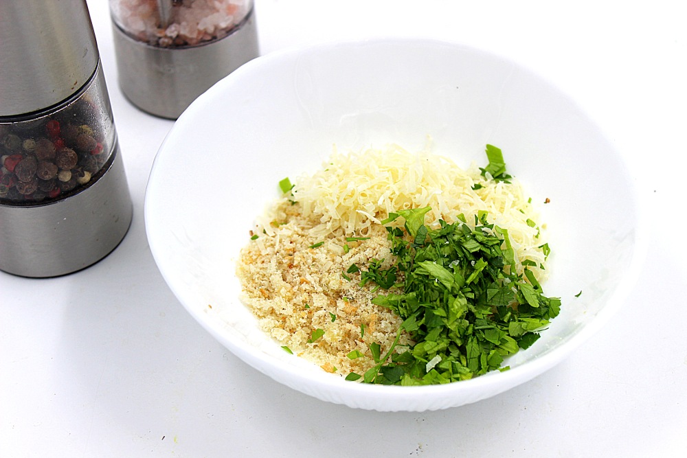 Смешать сухари, тертый сыр и измельченную петрушку.