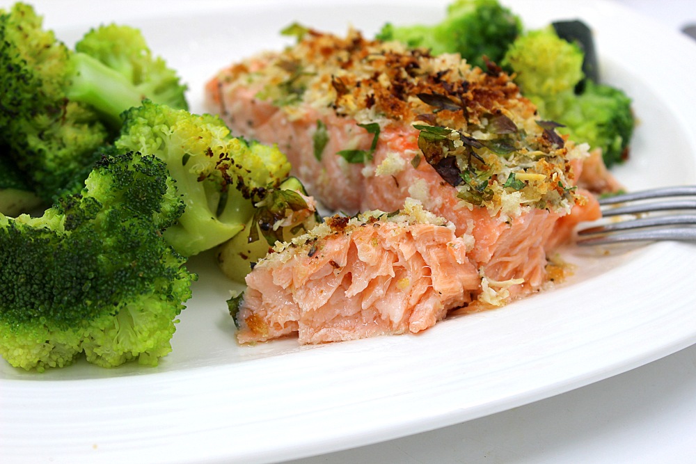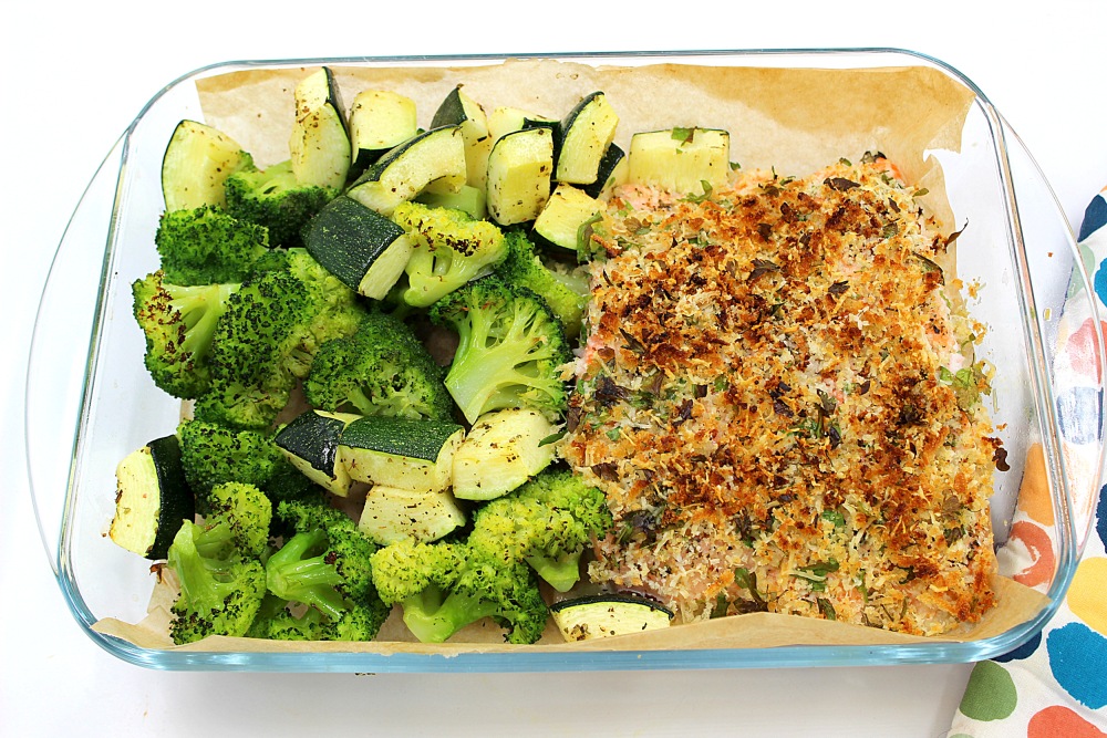 – Еще один вариант: сначала вы ставите в духовку овощи, а после докладываете лосось с сухарями.
