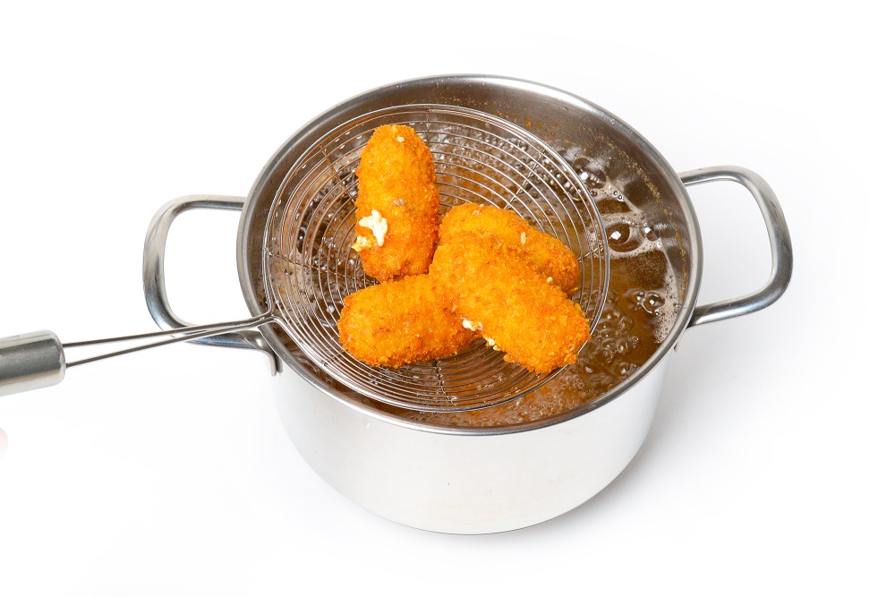 - Если термометра нет, опустите в горячее масло кусочек картофеля или лука – он сразу же начнет жариться и шипеть, выделяя множество пузырьков. Значит, масло достаточно разогрелось.